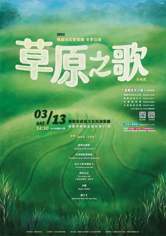 2021桃園市民管樂團冬季公演《草原之歌》,節目中樂團將帶來多首精彩曲目,除耳熟能詳的動畫配樂獅子王、木蘭,經典曲目動物狂歡節、非洲頌歌變奏曲,還有帶來精彩的上低音號協奏曲-綠色山丘,各位千萬別錯過了!
